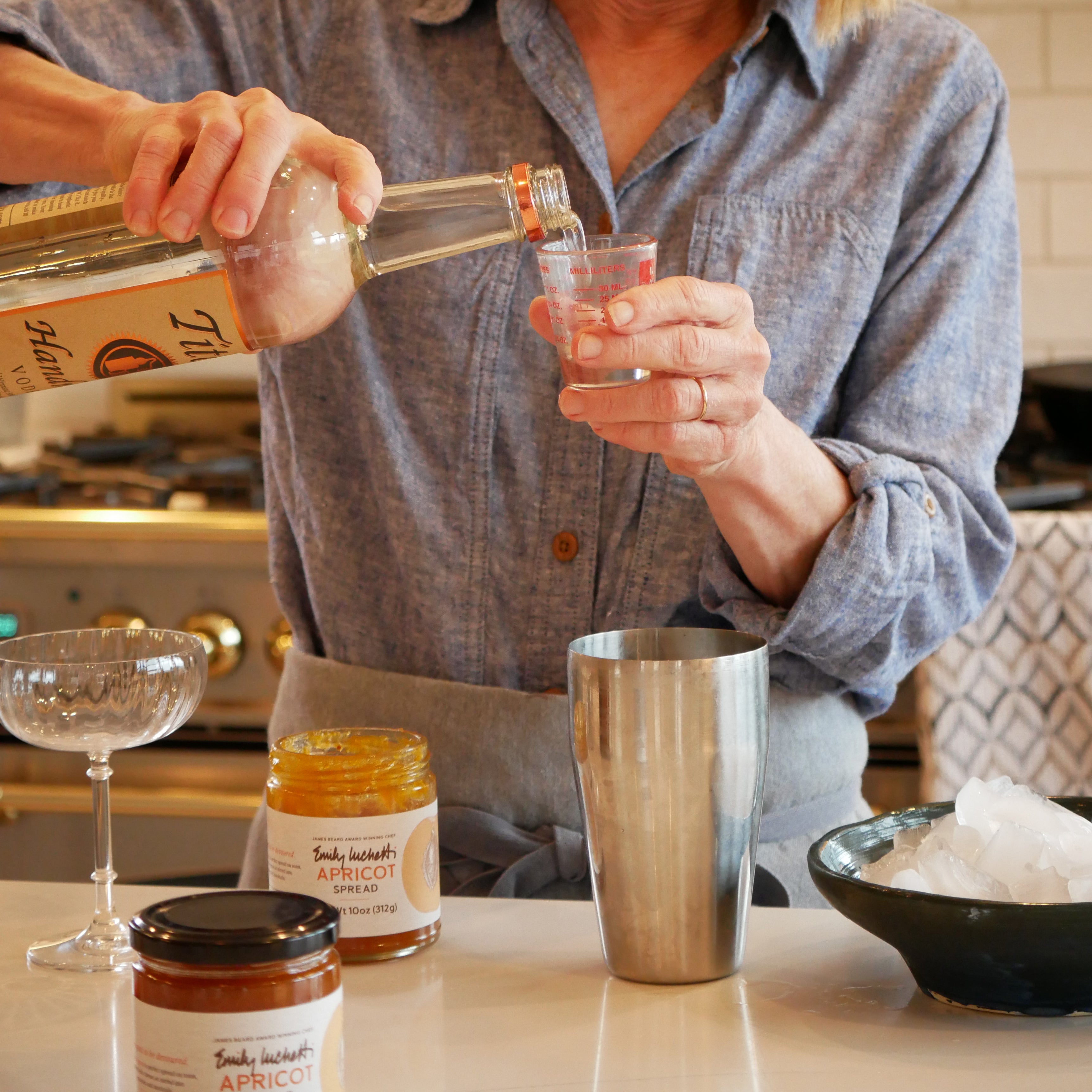 In a cocktail shaker with ice, mix the vodka, lemon juice, and apricot spread.